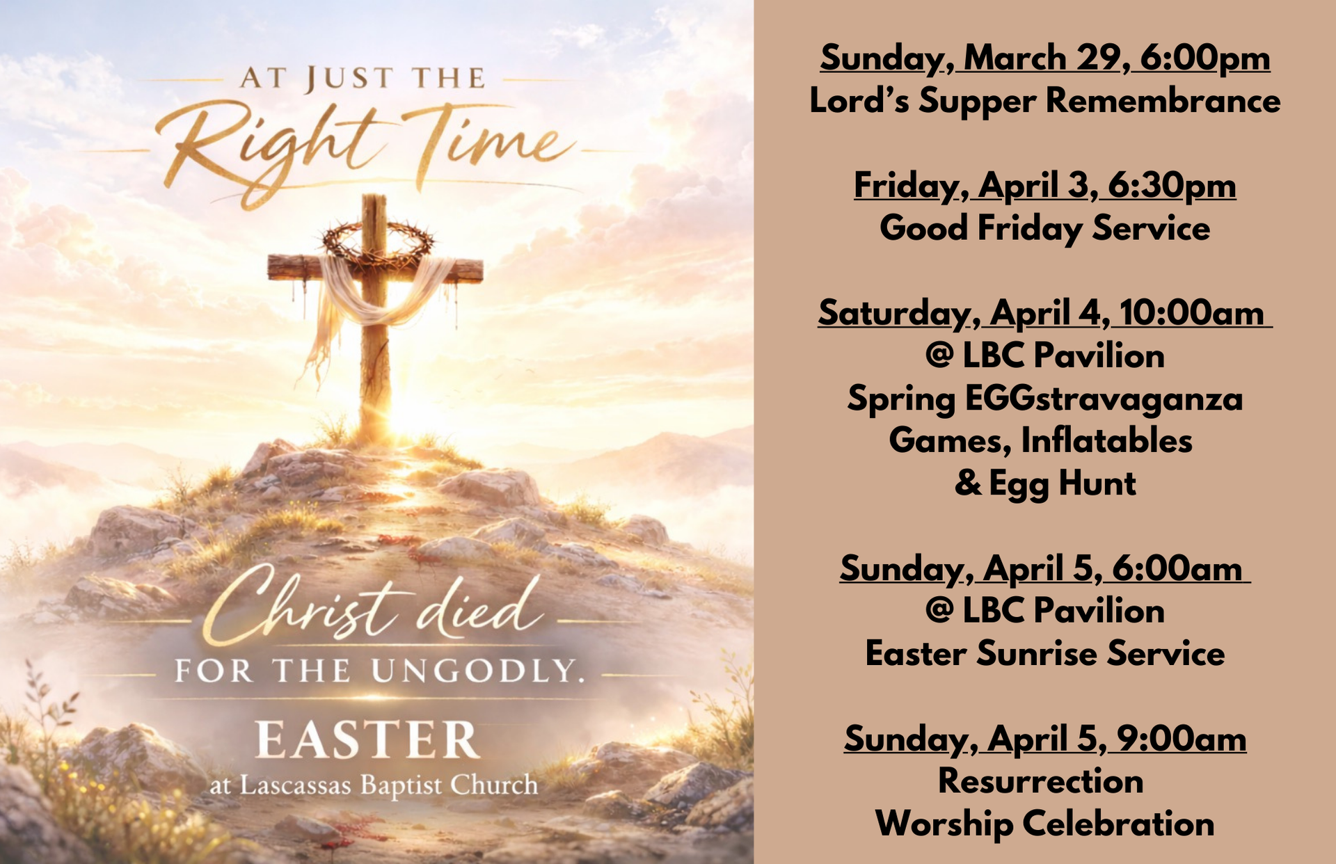 Join us as we celebrate the hope, power, and victory of the risen Christ this Easter season. At just the right time, God demonstrated His love for us through Jesus. Come worship with us as we remember the cross and rejoice in the empty tomb!